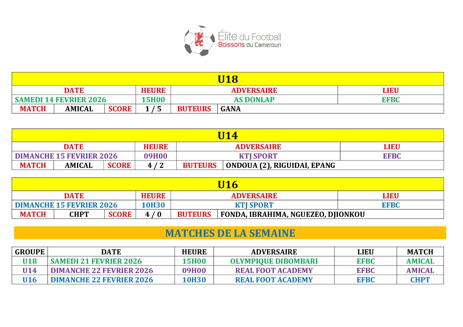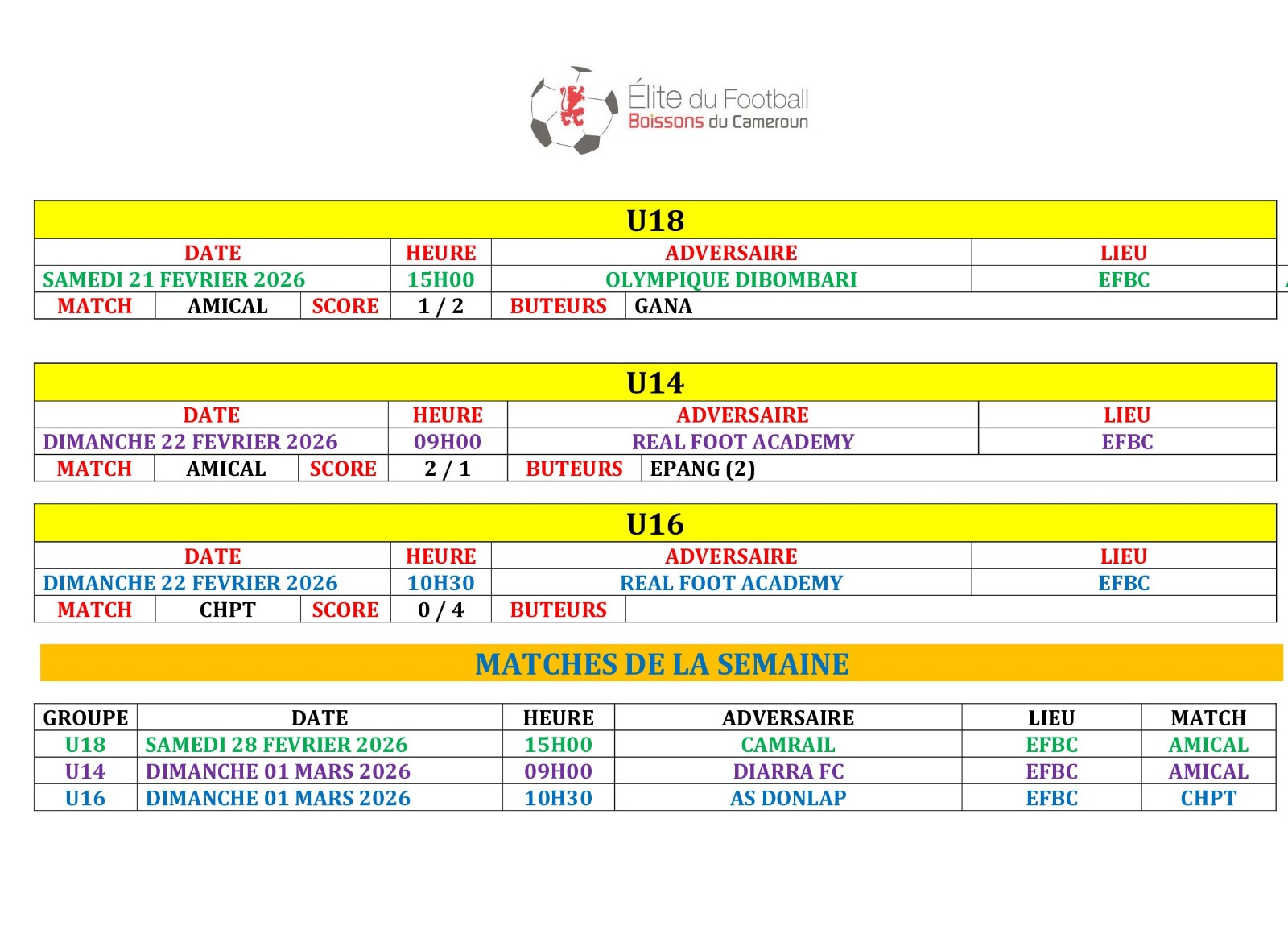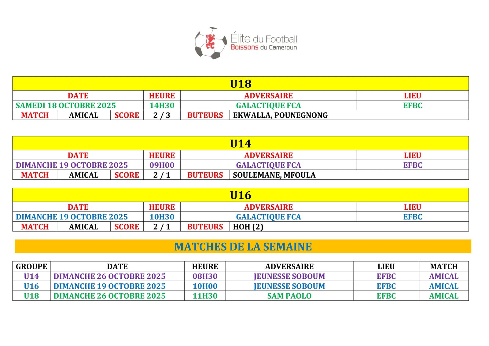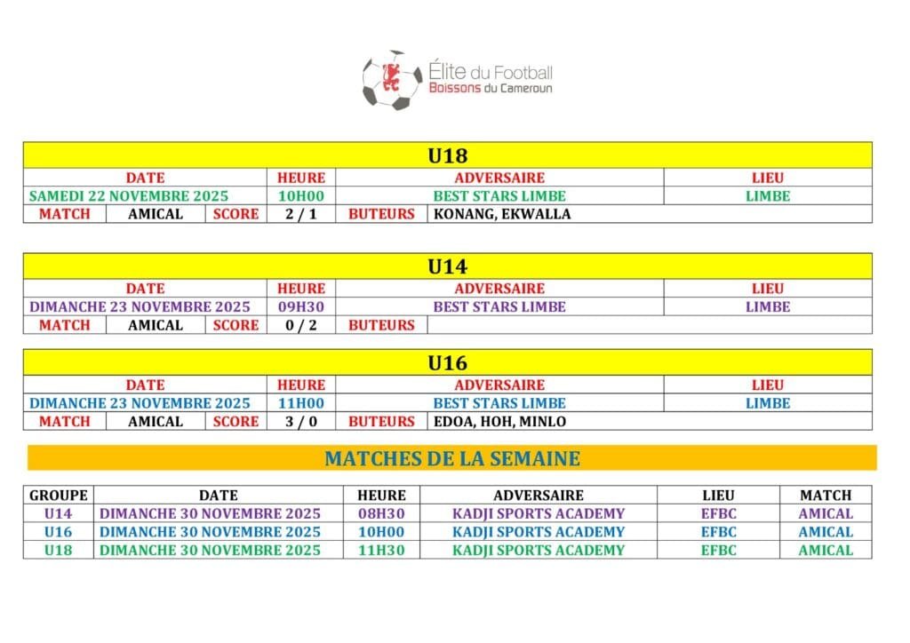 Ne manquez rien des prochains défis de l’EFBC ! Retrouvez tous les futurs matchs et résultats à venir dans notre Agenda. ⚽