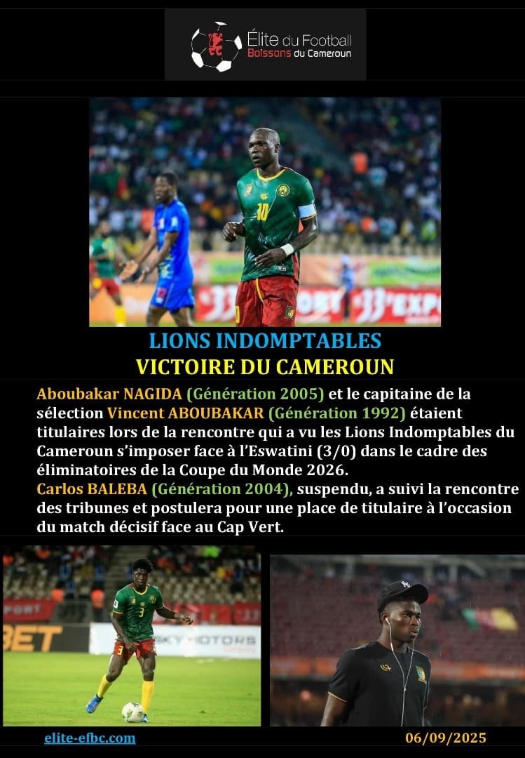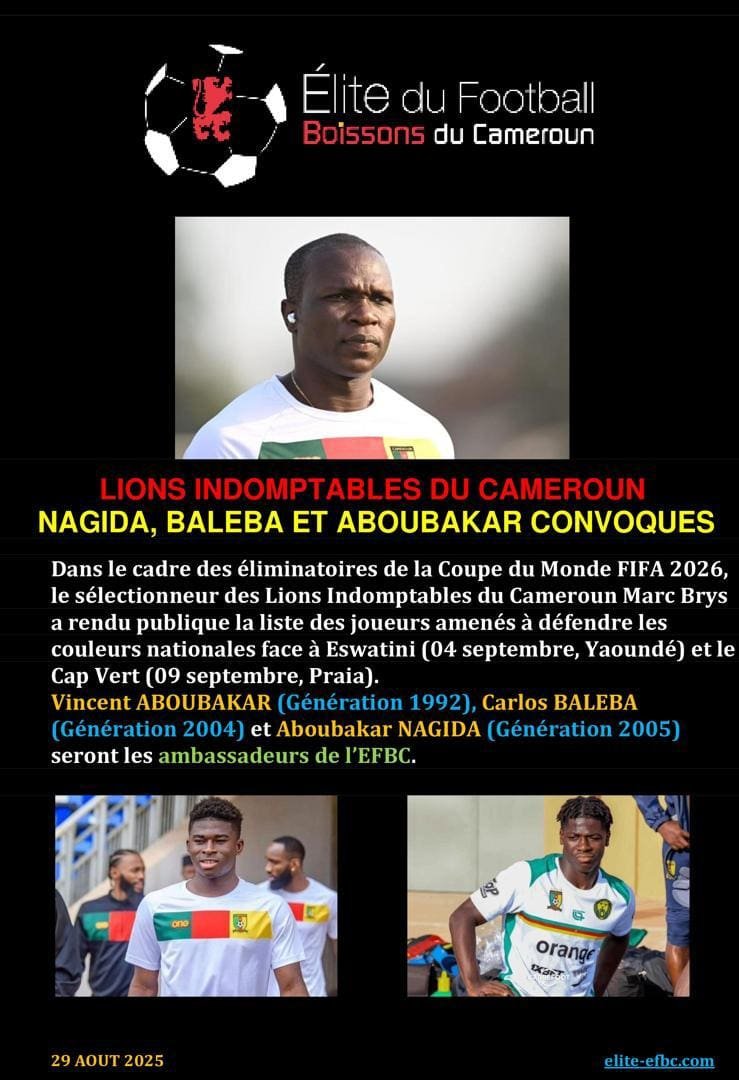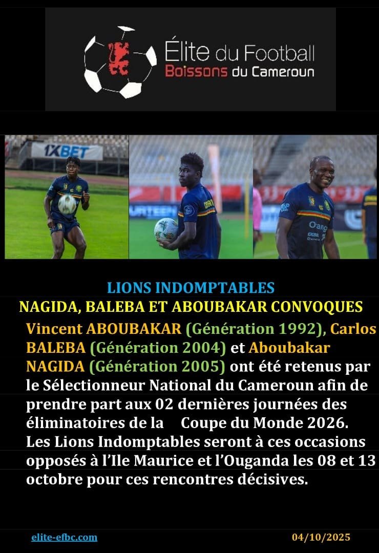 ANCIENS STAGIAIRES, Sélections nationalesLIONS INDOMPTABLES: NAGIDA, BALEBA ET ABOUBAKAR CONVOQUESEFBC4 octobre 2025