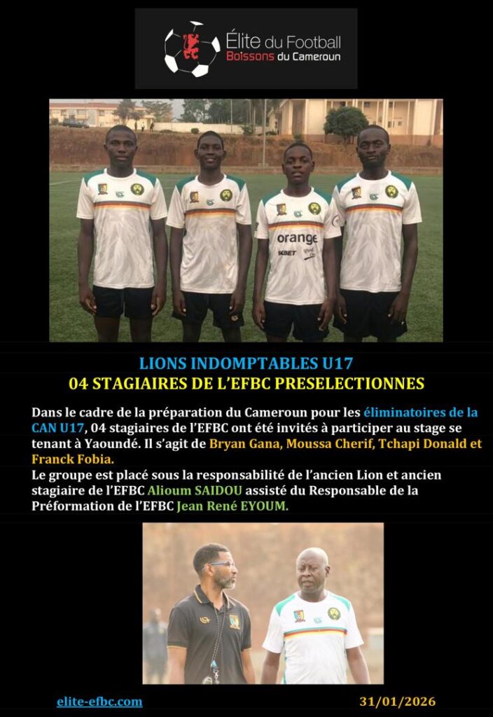 LIONS INDOMPTABLES U17: 04 STAGIAIRES DE L’EFBC PRÉSÉLECTIONNÉSEFBC2 février 2026ANCIENS STAGIAIRES, Sélections nationales